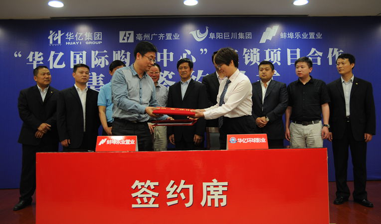 2013年5月7日下午,“華億國際購物中心”連鎖項目集中簽約儀式在華億國際報告廳隆重舉行。亳州廣齊置業(yè)有限公司董事長李光奇、阜陽巨川集團(tuán)董事長韋飛亞、蚌埠樂業(yè)地產(chǎn)有限公司董事長杜浩、安徽華億集團(tuán)董事長項義水,總裁項領(lǐng),副總裁張靖,副總裁吳文駿,華億偉晨文化公司總經(jīng)理孫艷等出席簽約儀式。儀式由華億集團(tuán)黨委書記、集團(tuán)副總裁陳愛國主持。?xml:namespace>