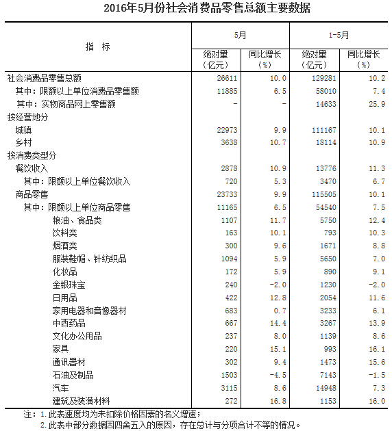 2016年5月份社會(huì)消費(fèi)品零售總額增長10.0%